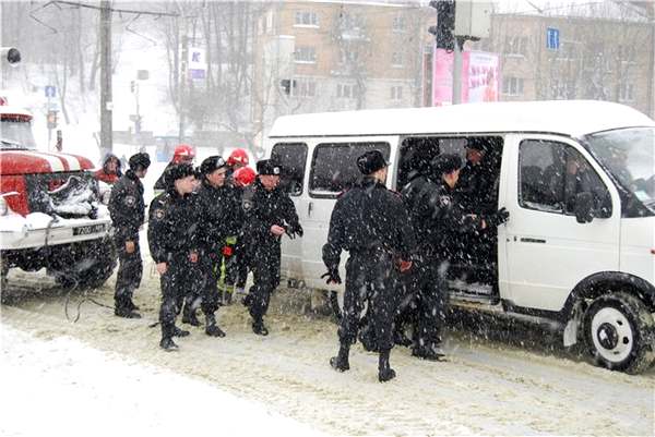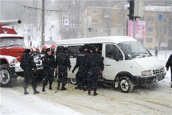 Феерический пример «доблести и мужества» украинской милиции. Львов, улица Княгини Ольги. Снегопад, Внизу стояли мчеесникы. Собрались ехать - да не куда. Перекрыто - пол-дороги, их стал объезжать микроавтобус который тут же забуксовал.