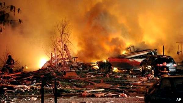 Pаместитель руководителя местной пожарной охраны Кенни Бэкон, отверг прдположение о падении самолета. и склоняется к версии о взрыве газа. На данный момент причина взрыва остается неизвестной. Но он был настолько мощным, что в радиусе двух километров в домах выбило стекла, взрывной волной были полностью разрушены два дома, возник пожар, вскоре огонь перекинулся на расположенных поблизости здания.. Фото AP