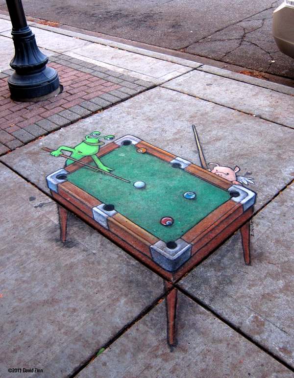 Художник самоучка и просто необычайно творческий человек Дэвид Зинн (David Zinn), проживающий в штате Мичиган, начиная с 2008-го года украшает улочки своего города Энн-Арбор трехмерными изображениями веселого зеленого создания по имени Слагго (Sluggo).