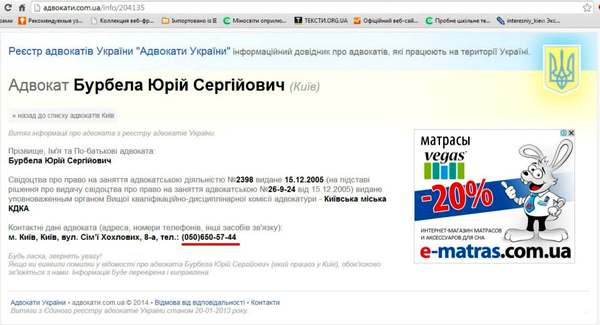 О том, что этот телефон принадлежит именно судье Юрию Бурбеле, можно узнать из другого открытого источника –реестра адвокатов Украины. До назначения судьей Юрий Бурбела работал адвокатом, и его контакты до сих пор сохраняются в реестре.