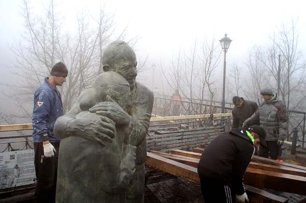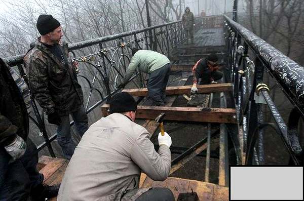 «Фашиствующие бандеровцы» как называют этих ребят российская пропаганда, без всяких тендеров и откатов, восстановили частично сгоревший во ремя противостояния на Грушевского, Мост Влюбленных который проходит над Петровской аллеей в районе стадиона "Динамо" и соединяет две части Мариинского парка.