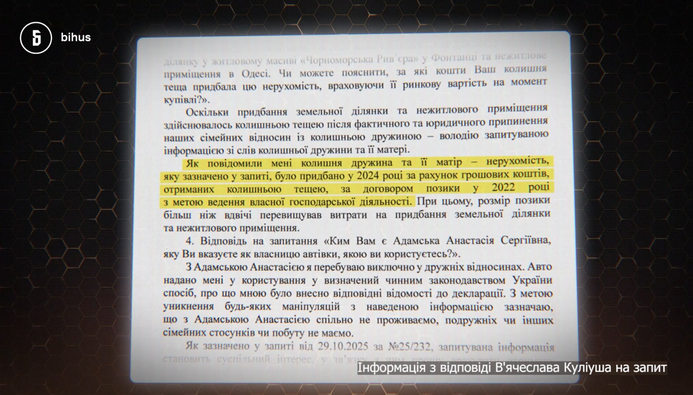 Звідки гроші в жінки, чиї офіційні доходи неспівмірні з такими покупками? Сам Куліуш пояснив усе просто: теща, мовляв, придбала нерухомість "за кошти, отримані за договором позики в 2022 році". Класичний "договір позики", який завжди з'являється вчасно.