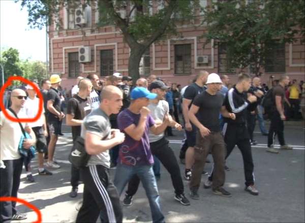 Оператор телекомпании «Новая Одесса» Олег Шпак обнародовал на своей странице в социальной сети Facebook, фотографии и видео, судя по которым, можно сделать вывод, что спортсмены» пытались избить еще одного фотографа. На кадрах видно, как удерживаемый милиционерами боевик наносит удар ногой в пах, мужчине с фотокамерой на шее.