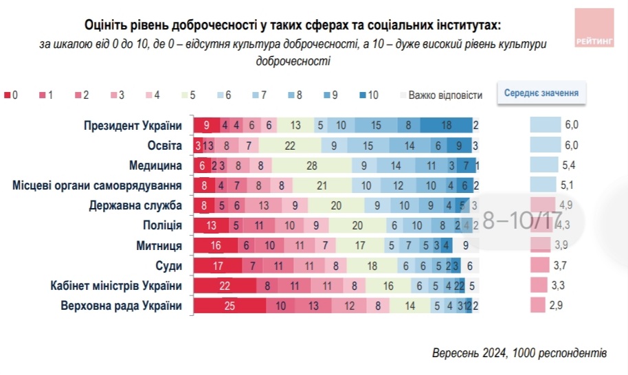 Інші інститути отримали такі оцінки: державна служба — 4,9 бали, поліція — 4,3; суди — 3,7 бали. Найнижчі оцінки мають Кабінет міністрів (3,3) та Верховна рада України (2,9).