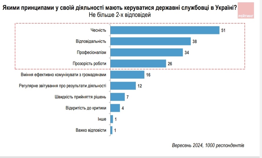 На думку половини опитаних, чесність є одним із основних принципів, якими мають керуватися державні службовці (частіше так вважали люди старшого віку та жителі невеликих міст і сіл). Для 38% громадян відповідальність має бути основним принципом, для 34% — професіоналізм (цей принцип частіше називали жителі міст).
