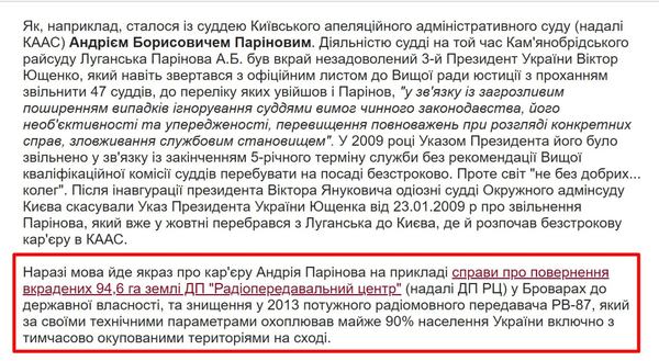 А вот муж Париновой сейчас является судьей известного уже всему миру Шестого апелляционного административного суда г. Киева. Паринов специалист по заказным, а не правосудным, судебным решениям “именем Украины”. Вот лишь один яркий пример из его позорной судейской деятельности.