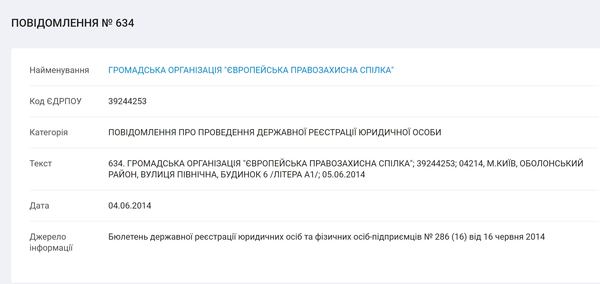 В аналитической системе YouControl содержится информация о том, что Марина Паринова является руководителем общественной организации "ЕВРОПЕЙСКИЙ ПРАВОЗАЩИТНАЯ СОЮЗ" (Код ЕГРПОУ: 39244253), которая была зарегистрирована в начале июня 2014 года. Название ОО совпадает с тем, которое было указано в документе, направленном Рапопорту в Кремль. Не прошло и месяца после письма “Казбека” Рапопорту, как ширма была создана.