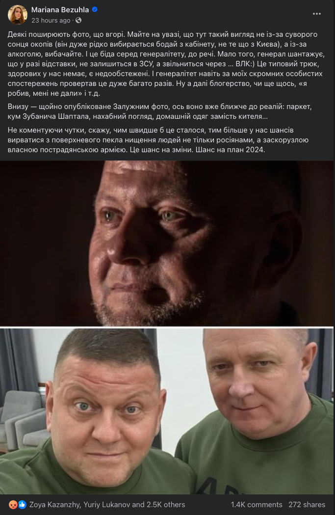 Пізно ввечері сам Валерій Залужний на своїй сторінці у Facebook виставив спільне фото з начальником Генштабу Сергієм Шапталою без підпису. Під цим фото дописувачі поставили понад 22 тисяч лайкі та залишили сотні коментарів з підтримкою та подякою генералу.