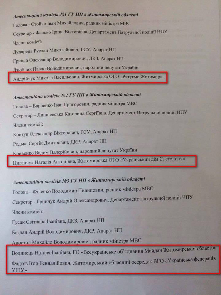 — Ігор Фадєєв — кримінальний авторитет «Москва», який відсидів у Бельгії та Росії, смторящій від ПР (А ще кажуть, що клікухи просто так не дають); — Наталія Циганчук — захисник криміналу, який сидить на бурштині в області, екс-адвокат блоку «К.у.ч.м.а.» та одного з найкорумпованішних нардепів Віктора Развадовського; — Микола Андрійчук — за 10 років моєї громадської діяльності жодного разу не чув про такого активіста, як і ГО «Рятуємо Житомир»; — Наталя Волинець — думаю, квота голови облради. Виходячи з цього, друзі мої, переатестація мєнтів — це чергова фікція, пустишка і договорняк. Чистити тільки під нуль.