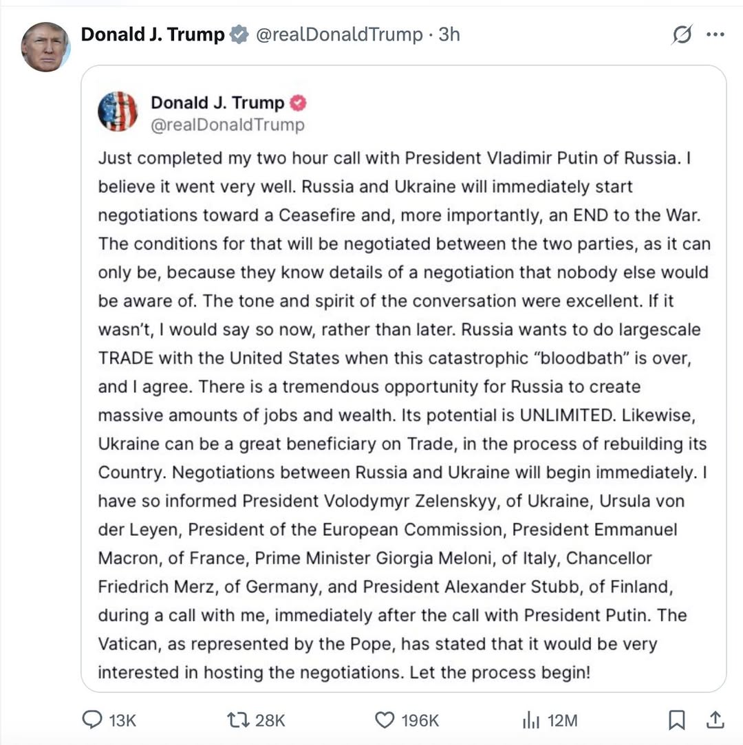"Після розмови з Путіним він заявив, що Росія і Україна повинні негайно розпочати переговори. Він, мабуть, забув, що за його мудрою вказівкою ці переговори вже розпочалися. А за годину до цієї доленосної розмови віце-президент Венс сказав, що переговори зайшли в глухий кут, і американська адміністрація усвідомлює це. Але виявилося, що не вся адміністрація здатна усвідомлювати це.