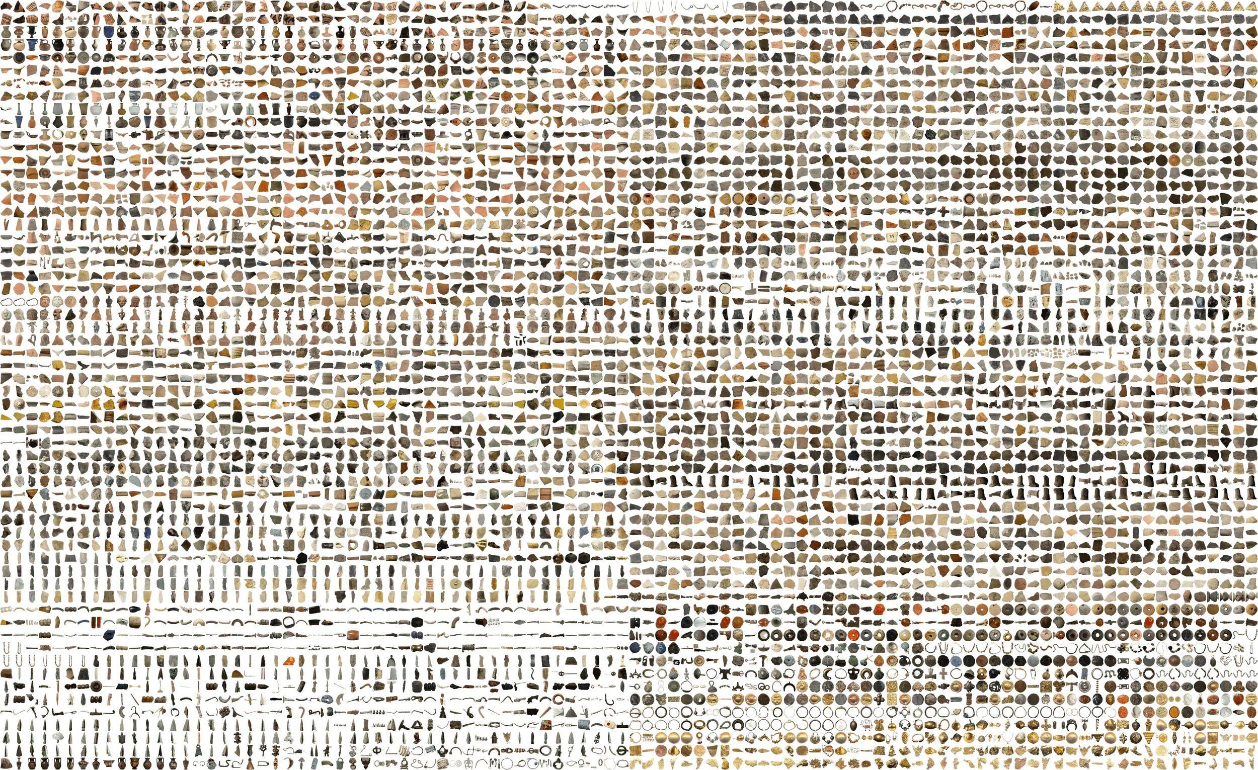 На зображенні нижче представлено близько 6 з 110 тисяч вивезених експонатів. Більшість знахідок – частини кераміки, знарядь праці тощо. Але є й чимало коштовностей із золота, срібла і дорогоцінних каменів.