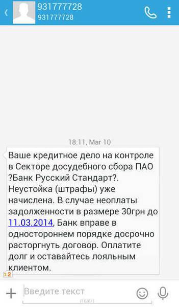«Ваше кредитное дело на контроле в Секторе досудебного сбора ПАО „Банк Русский стандарт“. Неустойка (штрафы) уже начислены. В случае неоплаты задолженности в размере 30 грн. до 11.02.2014, Банк вправе в одностороннем порядке досрочно расторгнуть договор. Оплатите долг и оставайтесь лояльным коиентом.» — писал мне отправитель.