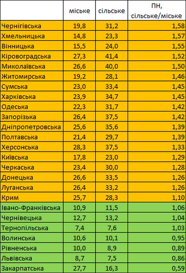 Однако на самом деле внебрачная рождаемость в селах выше, чем в городах (23,3% против 21,1%). Для сельского населения внебрачная рождаемость колеблется от 7,5-7,6% во Львовской и Тернопольской областях до 40,0-41,4% в Николаевской и Кировоградской. Для городского - от 7,5-8,2% в Тернопольской и Львовской до 32,2-32,9% в Херсонской и Кировоградской.