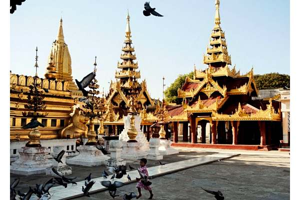 Город Паган. Мальчик гоняет голубей перед пагодой Швезигон (XI век), где хранятся священные реликвии
