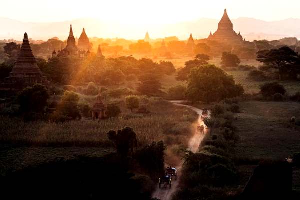 Неторопливая вереница на закате дня. Повозки, запряженные лошадьми, на дороге, идущей через город храмов Паган. Здесь 2500 пагод и памятников