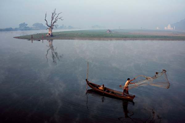 Воды Иравади. Вдали виднеется город Амарапура. Река, растянувшаяся на 2000 километров, пересекает всю Бирму и наполняет рыбацкие сети