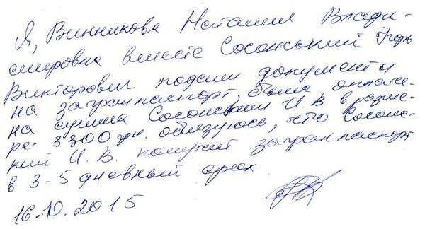 К слову, это никакая не фирма. Это Наталья Винникова так привлекает будущих клиентов. Ее услуги по срочному оформлению загранпаспорта стоят 3300 гривен. Во всяком случае, столько ей отдал Игорь Сосонский: