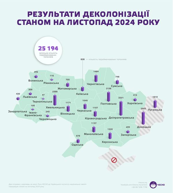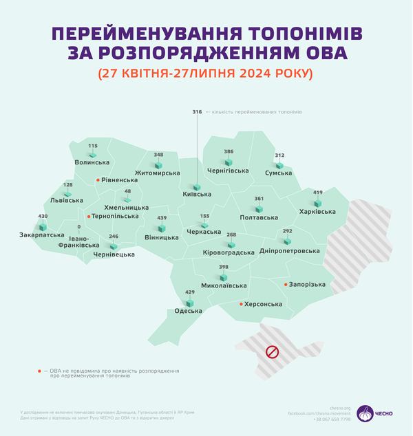 УІНП у відповідь на запит ЧЕСНО повідомив: “Інститут не є розпорядником інформації щодо загальної кількості перейменованих в Україні об’єктів топоніміки”.Тож там змогли надати дані станом на листопад 2024 року, які тоді самі отримали від ОВА (цікаво, а яку ж інформацію надавали адміністрації й чому не могли нею поділитися з журналістами?).