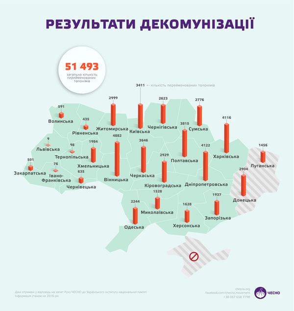 15 квітня 2015 року ВРУ ухвалила закон про декомунізацію. Парламент унормував процес, який стихійно розпочався після Революції гідності. У відповідь на запит ЧЕСНО в УІНП повідомили, тоді перейменували понад 50 тисяч об’єктів топонімії.