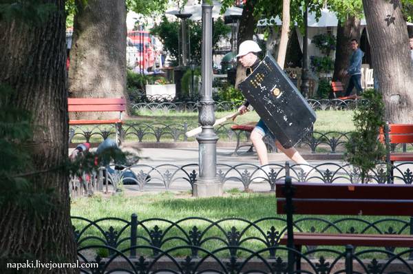 После этого боевики решили выйти в Гор. сад, где были фотографы и гуляющие. Народ начал разбегаться, но кого-то все же словили и избили.