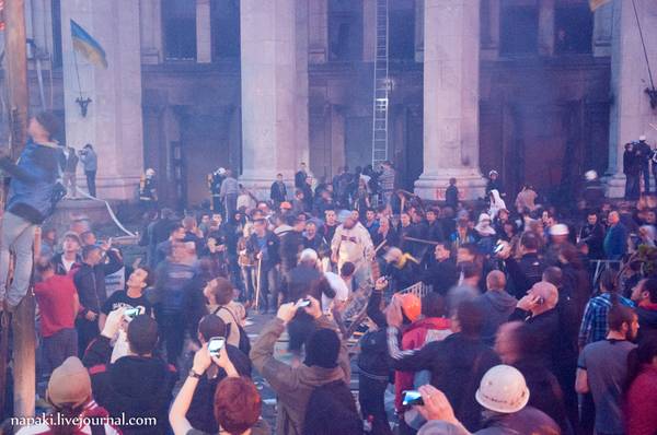 Знакомые потом рассказывали, что там находится штаб то ли «самообороны майдана», то ли «правого сектора». Вне зависимости от этого, «полная машина автоматов» боевиков не заинтересовала, поэтому попыток штурмовать подъезд не было и командиры постоянно звали людей обратно на Александровский. Попутно разнесли машину, в которой была повязана сине-желтая ленточка.