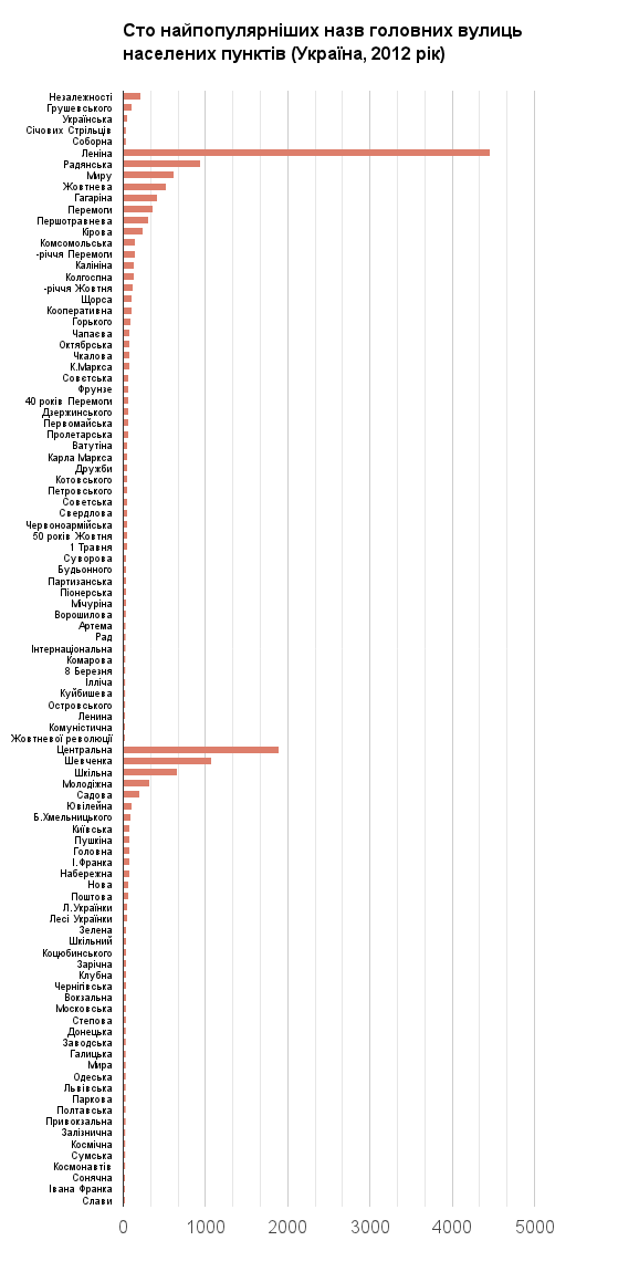 Тоталитарное наследие дышит нам в спину в названиях улиц наших населенных пунктов. Почти в 4,5 тысяч городов и сел главная улица носит имя тирана и убийцы миллионов Ленина. И в три раза меньше — имя Тараса Шевченко.