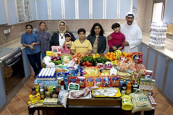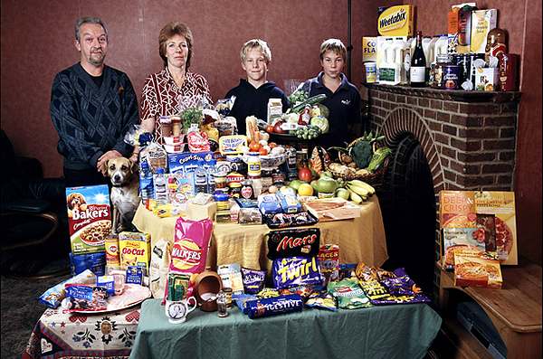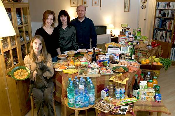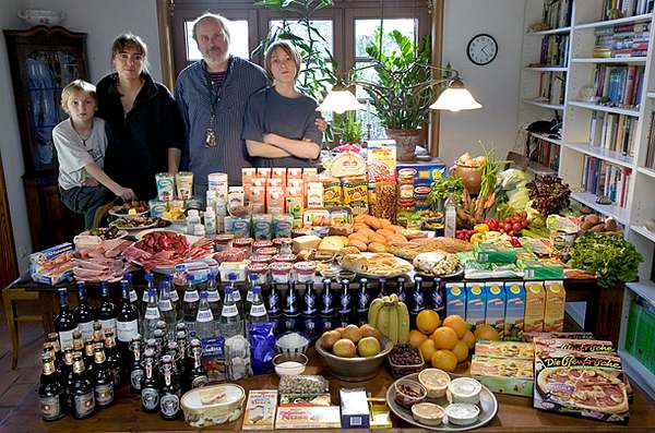 Фотограф Peter Menzel в рамках проекта «Hungry Planet», что в переводе означает «Голодная планета», путешествует по миру с целью создания фотографий семей из различных стран и их продуктовых покупок на неделю. Изучая эти фотографии можно прийти к очень интересным выводам о пользе или вреде определённых продуктов, популярных в каждом регионе. Например, американские семьи питаются фаст-фудом, чипсами, шоколадными батончиками и другими второсортными продуктами. У немцев, как не сложно догадаться, в рацион входит большое количество пива и других алкогольных напитков. А у жителей Эквадора 100% здоровое питание: злаки, фрукты и овощи.