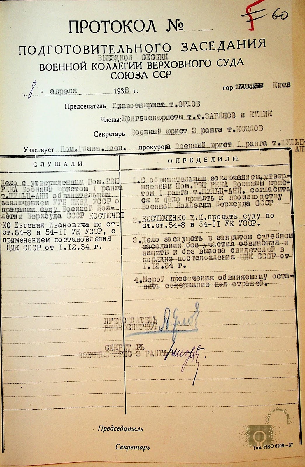 выездной сессией Военной Коллегией Верховного Суда СССР 9 апреля 1938 года, обв.: «являлся активным участником антисоветской диверсионно-террористической организации, действующей в г.Киеве» (по сталинскому списку) оперуполномоченный: Якубенко члены ВК ВС: Орлов, Зырянов, Кулик, Козлов приведен в исполнение: л-т ГБ Кривицкий |
