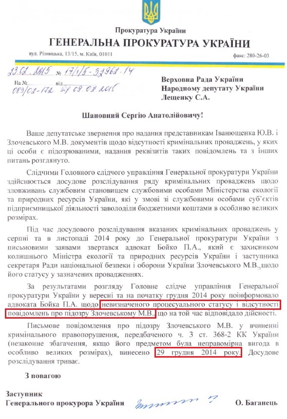 Повторюсь еще раз: письмо ГПУ об отсутствии подозрения против Злочевского и выдвижения подозрения Злочевского датированы одним месяцем — декабре 2014 года.