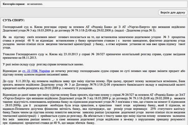 «Родовид» через суд признал дополнительное соглашение об установлении мегапроцентов недействительным. Суд установил, что подписант соглашения со стороны «Родовида» — Дмитрий Егоренко — превысил полномочия. Структура Фирташа попыталась обжаловать такое «несправедливое» решение, но 24 июля Высший хозяйственный суд окончательно отказался удовлетворить ее кассацию. После этого появилось и само заявление Генпрокуратуры.