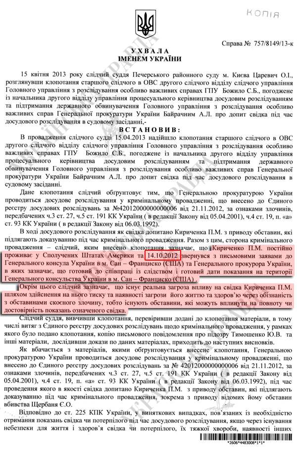 В распоряжении «Украинской правды» оказалось постановление судьи Печерского суда Оксаны Царевич, которая предоставила разрешение на допрос Петра Кириченко в судебном порядке.