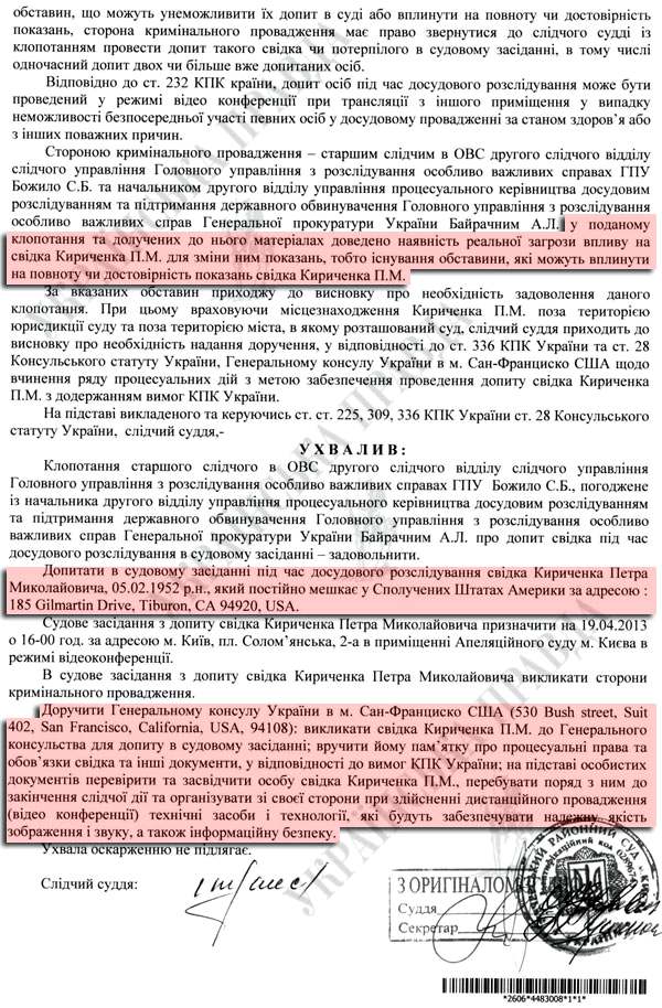 Для допроса свидетеля судья Царевич своим постановлением поручила Генеральному консулу провести техническую подготовку помещения представительства Украины в Сан-Франциско, удостоверить личность Петра Кириченко и находиться рядом со следователем при проведении следственных действий.