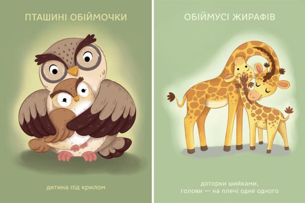 - “Обійманці” – це понад десять карток з ілюстраціями різних видів обіймів і їхньої інтенсивності, які не лише допоможуть впоратися зі страхом і тривогою, а й поглиблять зв’язок між батьками та дітьми. Наприклад, картка “обійми птахів” вказує на те, що потрібно обійняти дитину, ніби взявши її під крило, а “обійми кошеняти” – це ніжні дотики щічками та носиками;