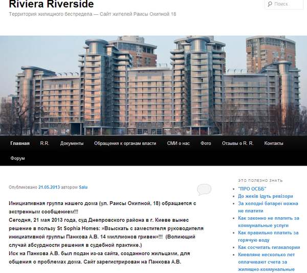 Как стало известно вчера, суд Днепровского района Киева 21 мая вынес решение, согласно которому владелец интернет-форума, который объединяет жителей одного из столичных домов, должен оплатить компании St Sophia Homes 14 млн грн.