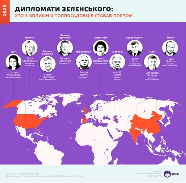 Що це, чергове підвищення, боротьба з політичними конкурентами чи тиха пенсія для топчиновників — питання риторичне. Рух ЧЕСНО розповідає про дипломатичний карʼєрний ліфт Зеленського і згадує, кого раніше президент відправляв послом після гучних відставок.