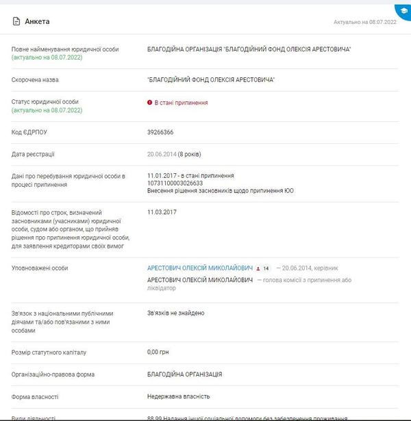 Отже давайте проведемо експеримент і перевіримо наявність «Благодійного фонду Олексія Арестовича» з кодом 39266366. Він був заснований ще у 2014 році, і зараз знаходиться у стані припинення.