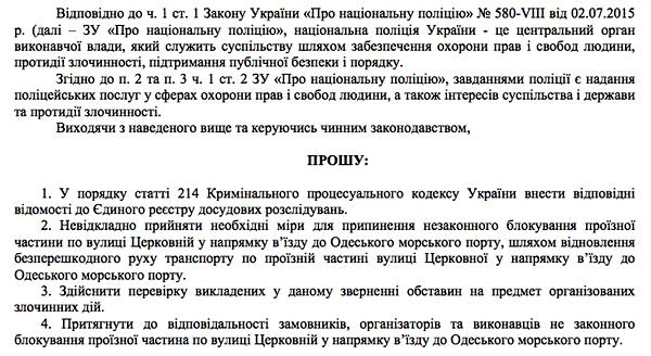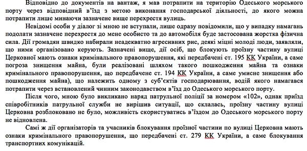 Данное дело (блокировка дороги к Одесскому порту частной фирмой и нанятыми ею лицами) внесено в реестр досудовых расследований еще 17-го января. Результат — ноль. Были совещания в горисполкоме, активисты лично были на приемах в полициях и гвардиях, у генералов и прочих. Результат — ноль. Т. е. реальная блокада Одесского порта длится уже скоро 4 месяца, а единственная цель блокады — «максимально обеспечить заработком платный шлагбаум порта».