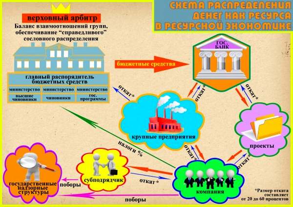 То, что крутится в нашей экономике, — не деньги, а финансовые ресурсы, которые только выглядят, как деньги. Их существенное отличие том, что финансовые ресурсы, распределяемые из бюджета, не могут «конвертироваться» в деньги. Они должны осваиваться и списываться. У нас динамизирующим фактором этого процесса, оборота финансовых ресурсов, является «откат». И есть «норма отката».