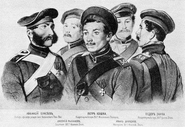 Герои обороны Севастополя 1854-1855 гг Афанасий Елисеев, Аксений Рыбаков, Петр Кошка, Иван Дымченко, Федор Заика. Литография Георга Вильгельма Тимма