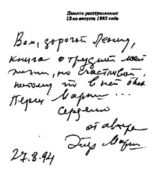 Читайте «свиток Эстер». В нем – правда нашей горькой истории, нашей надежды. 18 лет назад в своем гостеприимном доме в Ор-Иегуде, подписывая эту книгу, она сказала: «В ней – только часть правды. Всей – увы – не знает никто. И вряд ли узнает». И надписала книгу так, как не могла не надписать: «Вам, дорогой Леонид, книга о трудной моей жизни, но счастливой, потому что в ней был Перец Маркиш...».