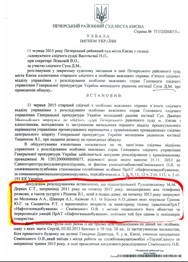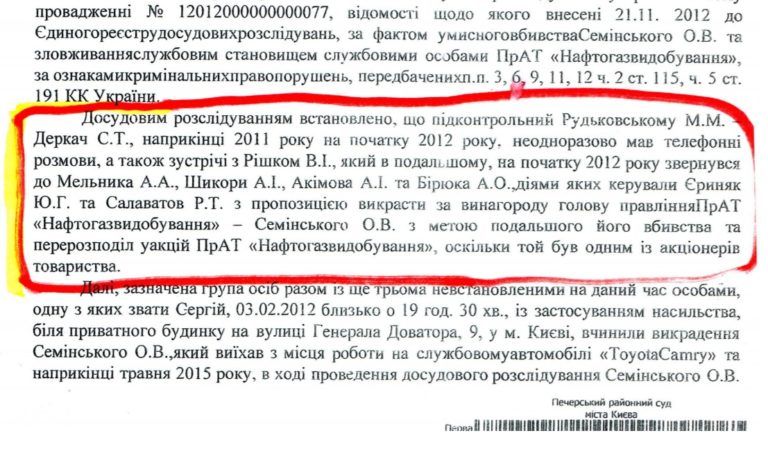 Чуть раньше, в марте того же года суд отдал Ериняку на ответственное хранение арестованное имущество. Выше упоминалось, что следователь Сус считал его причастным к похищению Семинского, но подозрение не предъявил. Однако сегодня Ериняк и еще ряд лиц являются обвиняемыми по делу о разбое, бандитизме, вымогательстве и лишении свободы другой лицо не Семинского. Так вот, в марте 2018 года коллегия судей во главе с Сергеем Агафоновым вернула Ериняку интересные документы: «Соглашение» от 17.10.2012 о передаче дивидендов ЧАО «Нефтегаздобыча», «Соглашение-1» от 17.10.2012 — о возвращении долгов ЧАО «Нефтегаздобыча» на 1 л.; проспект «Распределение дивидендов по Итогам 2013 года и 2014 года ЧАО «Нефтегаздобыча».