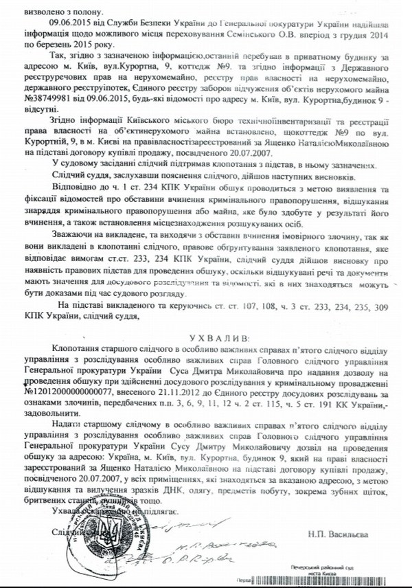 В июне 2015 года судья Печерского суда Васильева (теперь уже покойная) выдала следователю Сусу решение на обыск коттеджа в Киеве по ул. Курортная, 9. Этому обращению предшествовало сообщение СБУ, что с декабря 2014 года по март 2015 года Семинский якобы содержался именно в этом доме.