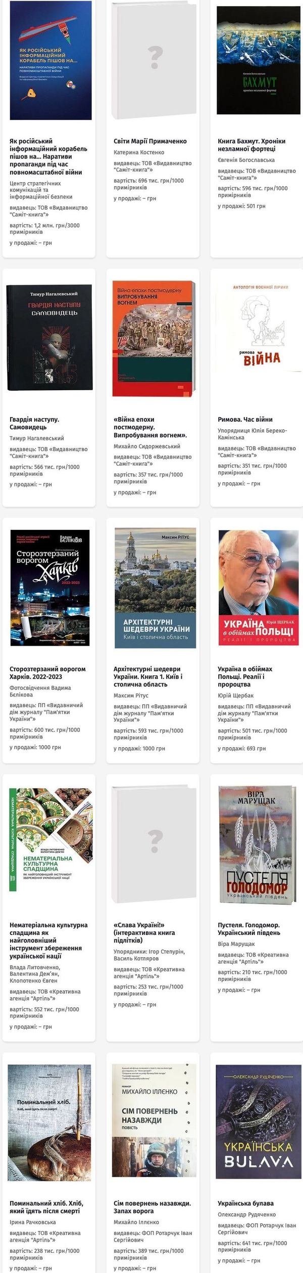 Втім, журналісти NGL.media виявили, що деякі з виданих у межах державної програми книжок продаються на книжкових сайтах. При цьому, за даними Держаудитслужби, вартість цих книжок у вільному продажі є нижчою, ніж передбачена договорами з ЦЗІПУ. Наприклад, книжка Євгенії Богославської «Бахмут: хроніки незламної фортеці» продається на офіційному сайті «Саміт-Книга» за 500 грн, хоча ЦЗІПУ уже заплатив видавництву по 662,5 грн за примірник. Схожа історія і з видавництвом «Фоліо», яке уже отримало по 410 грн за книжку «Дума про Потилицю», а продає її по 240 грн.