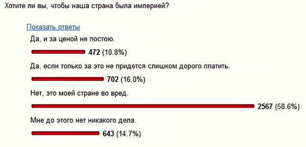 Для вас – лично для вас - важно, чтобы Россия была империей? Чтобы ближние страны нам повиновались, а дальние пускай нас и не любили бы, зато боялись? Чтобы мы, как прежде, были Великой Державой, даже если за это придется платить личными свободами и бедностью?