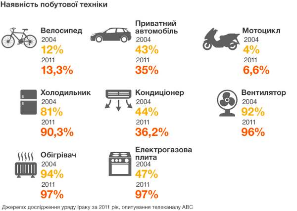 Несмотря на проблемы с электроснабжением, некоторые бытовые товары и предметы повседневного обихода более распространены, чем были в 2003 году. Как следует из исследования, проведенного иракским правительством, количество автомобилей в частной собственности уменьшилось, но выросло количество людей, которые пользуются велосипедами и мотоциклами.