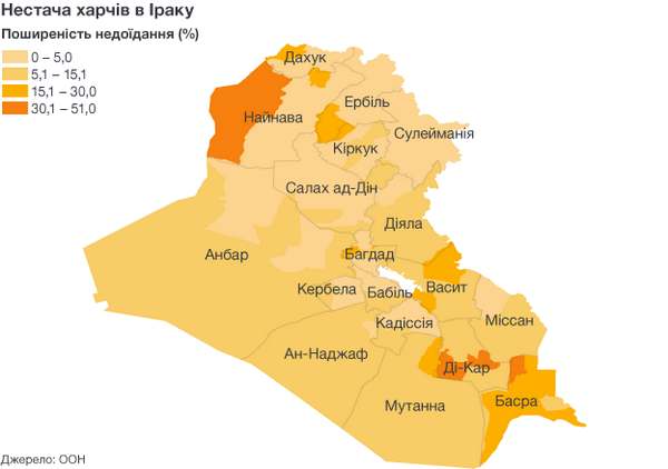 Но несмотря на то, что процент невелик, это составляет 1,9 млн человек. Больше всего от недоедания страдают южные области Басра и Ти-Кар, а на севере — Багдад и Найнава.