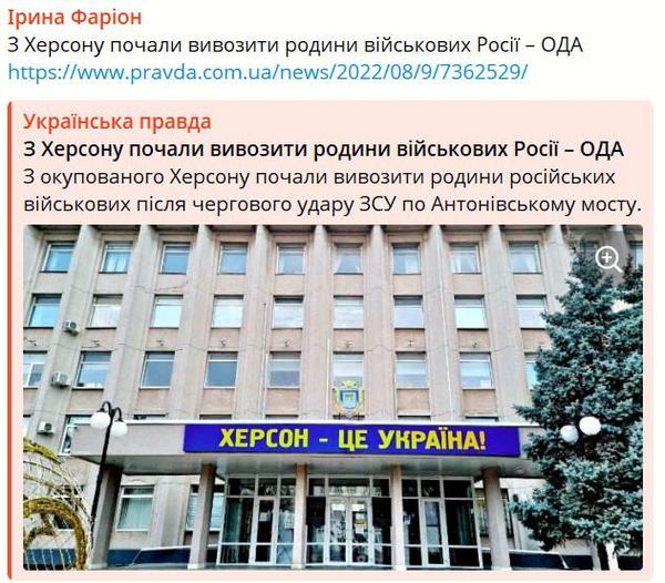 З тимчасово окупованого на той час Херсону почали вивозити родини військових рф. Цю новину поширює Ірина Фаріон у своїй інформаційній стрічці.