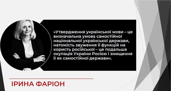 Ну і на завершення інформаційної стрічки цього дня - самоцитата від Ірини Дмитрівни: «Утвердження української мови - це визначальна умова самостійної національної української держави, натомість звуження її функцій на користь російської - це подальша окупація України Росією і знищення її як самостійної держави».