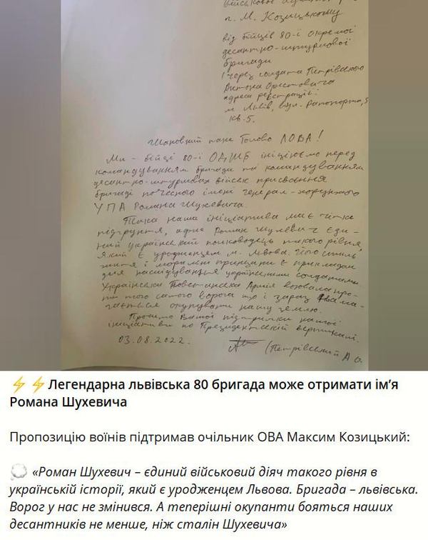 Цього дня Ірина Фаріон на новину про те, що «Легендарна львівська 80 бригада може отримати ім’я Романа Шухевича». Начебто пропозицію воїнів підтримав очільник ОВА Максим Козицький: «Роман Шухевич – єдиний військовий діяч такого рівня в українській історії, який є уродженцем Львова. Бригада – львівська. Ворог у нас не змінився. А теперішні окупанти бояться наших десантників не менше, ніж сталін Шухевича», — йшлося у зверненні бійців.