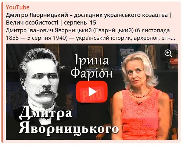 «5 серпня 1940 року відійшов у Вічність найромантичніший дослідник Запорозької Січі пасіонарний Дмитро Яворницький - спалах нашої історичної свідомости. У контексті теперішньої часткової окупації Запорізької области праця Яворницького надактуальна», — ще від просвітительки на авторську студію про цього видатного українця: .